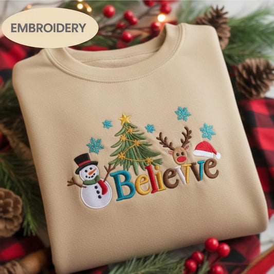 Believe Christmas Embroidered Sweatshirt, Cute Holiday Crewneck, Snowman Reindeer Tree Shirt, Cozy Winter Gift Sweater, Christmas Shirt