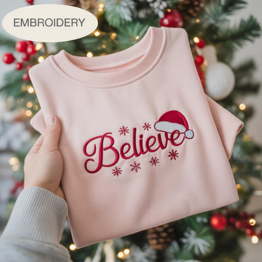 Believe Christmas Embroidered Sweatshirt, Santa Holiday Crewneck, Festive Embroidery Shirt, Cozy Winter Gift Sweater