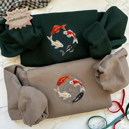 Japanese Koi Fish Embroidered Sweatshirt, Asian Carp Hoodie, Nature Cottagecore Fall Shirt, Fishing Lover Gift