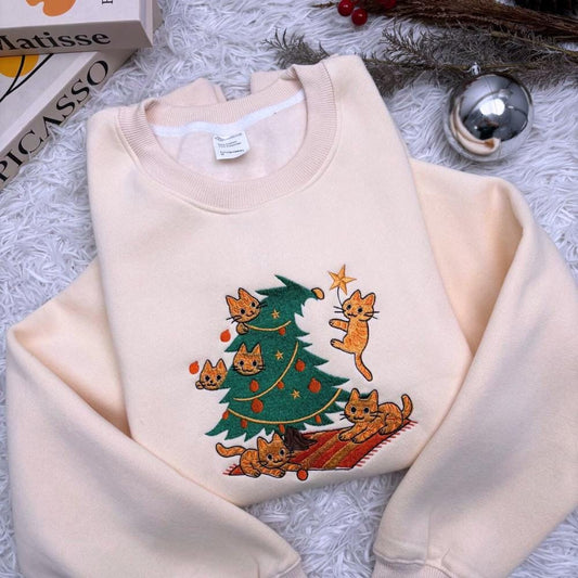 Orange Cat Embroidered Christmas Sweatshirt | Funny Holiday Hoodie | Cute Cozy Cat Lover Embroidered Christmas Sweater