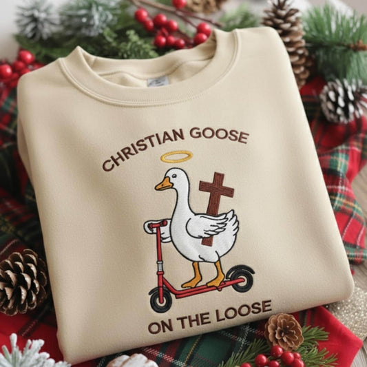 Christian Goose On The Loose Embroidered Sweatshirt, Funny Goose Sweatshirt, Scooter Goose Christmas Sweatshirt, Religious Humor Gift